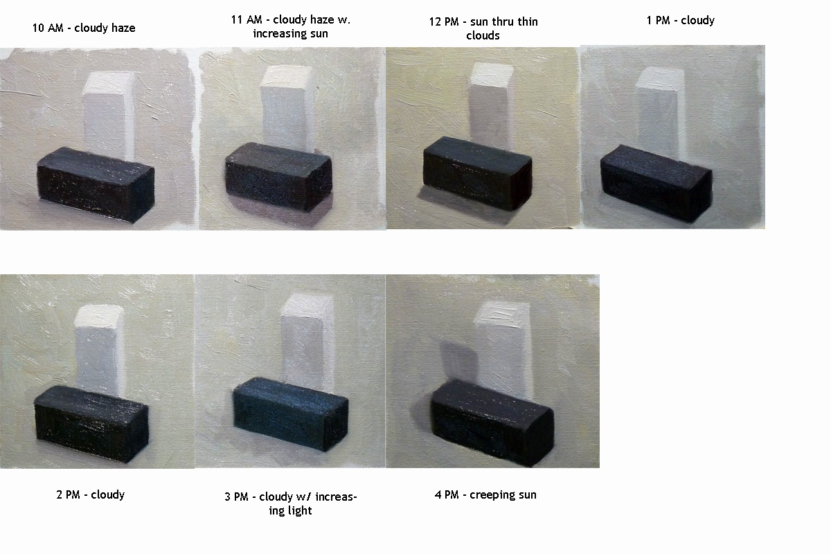 Here is a series of block quick-sketches (10-15min) done on a mostly cloudy day with some intermittent creeping sun, done about every hour. The point here is to observe subtle light changes throughout the day. The paintings are not overly chromatic but subtly intense and I'm not sure how well they would read online compared to the originals as they are layered and impressionistic (which is always a problem with photographical translation so I tweaked in them to look a little more correct on a computer though this makes them less subtle compared to the originals). There are some important things to note about this exercise: I did not use black paint, only a full spectrum palette; the emphasis is not on value contrast but color and not on over-emphasized color but truthful, relative color intensities. Drawing obviously took a back seat.